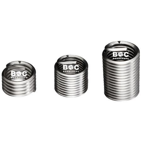 Gewindeeinsatz frei durchlaufend aus rostfreiem Stahl. Zur Gewindepanzerung von Werkstoffen geringer Scherfestigkeit, wie z. B. Aluminium- oder Magnesiumlegierungen, sowie zur Gewindereparatur abgenutzter oder beschädigter Gewinde.