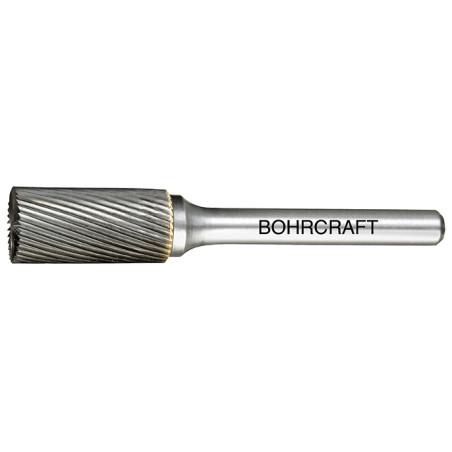 HM-Frässtift Form B Zylinder, Stirnverzahnung. Mit Einfachverzahnung Fein für saubere Oberflächen bei der Bearbeitung von Gusseisen, Stahl, Edelstahl und härteren Werkstoffen. Baumaße ähnlich DIN 8033. Anwendung: Zum Kantenbrechen, Entgraten, Schweißnahtbearbeitung und Flächenbearbeitung.
