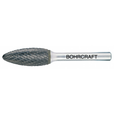 HM-Frässtift Form H Flamme, TiAlN. Mit Kreuzverzahnung für hohen Materialabtrag bei Gusseisen, Stahl und Edelstahl. Zusätzliche TiAlN-Beschichtung für höhere Oberflächenhärte und höhere Warmhärtebeständigkeit wodurch die Standzeit deutlich erhöht wird. Anwendung: Zum Kantenbrechen, Entgraten, Schweißnahtbearbeitung und Flächenbearbeitung.