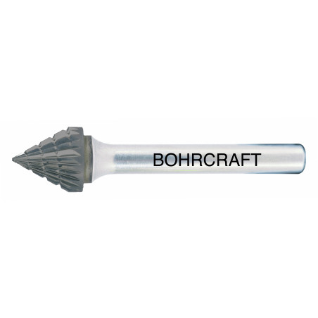 HM-Frässtift Form J Kegel 60°, TiAlN. Mit Kreuzverzahnung für hohen Materialabtrag bei Gusseisen, Stahl und Edelstahl. Zusätzliche TiAlN-Beschichtung für höhere Oberflächenhärte und höhere Warmhärtebeständigkeit wodurch die Standzeit deutlich erhöht wird. Baumaße ähnlich DIN 8033. Anwendung: Zum Kantenbrechen, Entgraten, Schweißnahtbearbeitung und Flächenbearbeitung.