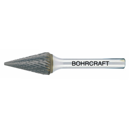 HM-Frässtift Form M Spitzkegel TiAlN. Mit Kreuzverzahnung für hohen Materialabtrag bei Gusseisen, Stahl und Edelstahl. Zusätzliche TiAlN-Beschichtung für höhere Oberflächenhärte und höhere Warmhärtebeständigkeit wodurch die Standzeit deutlich erhöht wird. Baumaße ähnlich DIN 8033. Anwendung: Zum Kantenbrechen, Entgraten, Schweißnahtbearbeitung und Flächenbearbeitung.