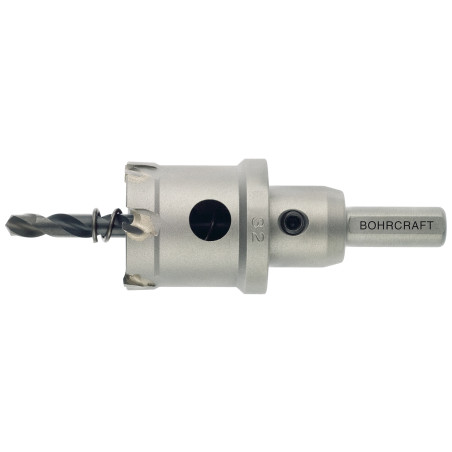 Solide konstruierte, einteilige (Schaft und Krone) Lochsäge mit Hartmetall Zahnschneiden. Schnitttiefe von max. 10 mm. Auswechselbarer Führungsbohrer aus HSS-Co 5% Kobalt mit Kreuzanschliff nach DIN 1412 C. Anwendung: Geeignet für Stahl, Buntmetalle, Kunststoff, Holz, Gips- und Leichtbauplatten bis 4 mm Materialstärke. Auch für rostfreien Stahl (V2A und V4A) bis max. 2 mm Materialstärke geeignet. Nur drehend benutzen!