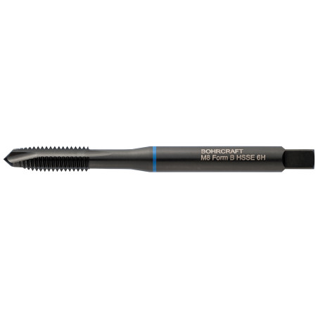 Industrie Maschinengewindebohrer Blauring, DIN 371 HSS-E Co 5%, Form B. Zum Schneiden von metrischen ISO-Gewinden DIN 13. Spezielle Schneidengeometrie und vaporisierte Oberfläche. Für Durchgangsgewinde in VA- und rostfreien Stählen bis 1000 N/mm² Festigkeit.