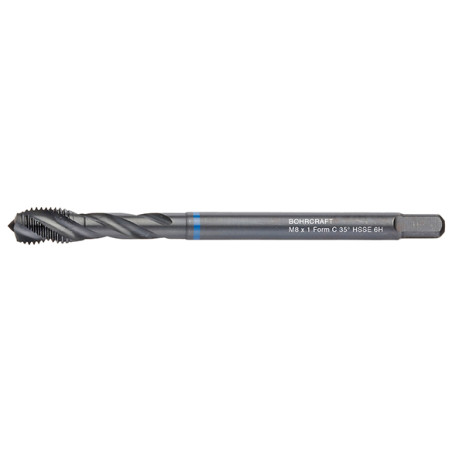 Industrie Maschinengewindebohrer Blauring, DIN 374 HSS-E Co 5%, 35° Rechtsspirale. Zum Schneiden von metrischen ISO-Gewinden DIN 13. Spezielle Schneidengeometrie und vaporisierte Oberfläche. Für Durchgangs- und Sacklochgewinde in VA- und rostfreien Stählen bis 1000 N/mm² Festigkeit.