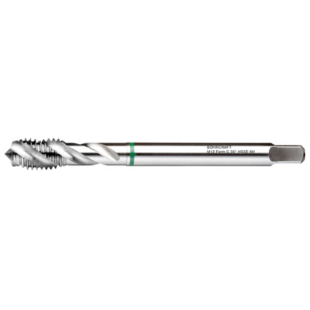 Industrie Maschinengewindebohrer Grünring, DIN 376 HSS-E Co 5%, Form C, 35° Rechtsspirale. Zum Schneiden von metrischen ISO-Gewinden DIN 13. Für Durchgangs- und Sacklochgewinde. Für den universellen Einsatz in allgemeine Baustähle, Automatenstahl, unlegierten Einsatzstählen und Aluminiumlegierungen (kurzspanend) bis 1000 N/mm² Festigkeit.
