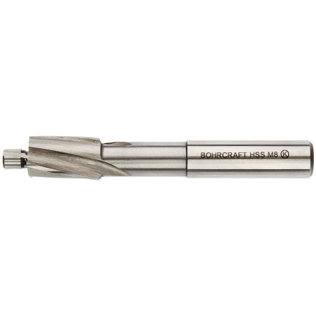Flachsenker mit festem Führungszapfen, Hochleistungs-Schnellarbeitsstahl, 3 Schneiden, 180° Senkwinkel. Anwendung: Zur Herstellung von Senkungen für Zylinderkopfschrauben, Sechskantschrauben und Muttern. Ideal zum grat- und ratterfreien Senken in Stahl, Guss, Bunt- undLeichtmetallen. Beste Ergebnisse bei niedriger Schnittgeschwindigkeit. Für Senkungen nach DIN 74, Blatt 2, Form H – J – K.
