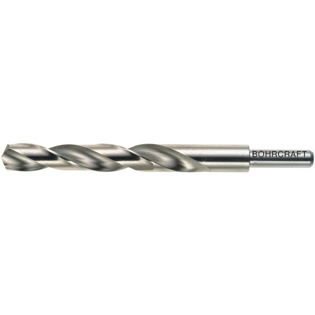 Spiralbohrer mit reduziertem Schaft (bis 16 mm auf 10 mm, darüber 13 mm) aus Hochleistungs-Schnellarbeitsstahl, geschliffen, zylindrisch, kurze Ausführung, rechtsschneidend, Typ N, Spitzenwinkel 118°, Kreuzanschliff nach DIN 1412 C. Anwendung: Für Bohrarbeiten mit höherer Beanspruchung und großer Rundlaufgenauigkeit in Metall z.B. Stahl, Grauguß, Sintereisen, etc.