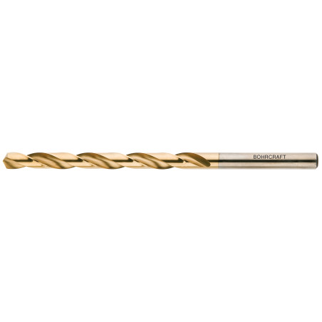 Spiralbohrer aus Hochleistungs-Schnellarbeitsstahl (5 % Kobalt), zusätzlich mit TiN Beschichtung für höhere Standzeit. Zylindrisch, lange Ausführung, rechtsschneidend, Typ N, Spitzenwinkel 130°, Kreuzanschliff nach DIN 1412 C. Anwendung: Für Stahl und Stahlguss legiert und unlegiert (bis 1.200 N/mm² Festigkeit), Titan und Titanlegierungen, rost- und säurebeständigen Stahl, V2A und V4A Stahl, Warm- und Kaltarbeitsstahl, Wälzlagerstahl.