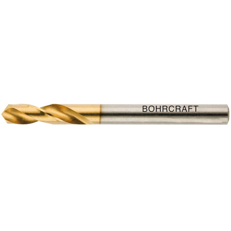 Spiralbohrer aus Hochleistungs-Schnellarbeitsstahl (5 % Kobalt), zusätzlich mit TiN Beschichtung für höhere Standzeit. Zylindrisch, extra-kurze Ausführung, rechtsschneidend, Typ N, Spitzenwinkel 130°, Kreuzanschliff nach DIN 1412 C. Anwendung: Zum Bohren von legierten und unlegierten Stählen und Guß über 800 N/mm² Festigkeit wie z.B. Wälzlagerstähle, Warm- und Kaltarbeitsstähle. Profi-Ausführung.