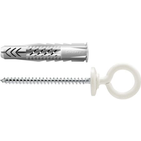 Der fischer Universaldübel UX ist ein Kunststoffdübel aus hochwertigem Nylon. Der fischer Universaldübel verspreizt in Vollbaustoffen und verknotet in Hohl- und Plattenbaustoffen für maximalen Halt. Damit ist der fischer UX immer die richtige Wahl – auch bei einem unbekannten Baustoff. Der Rand verhindert ein Tieferrutschen bei der Montage. In der Version mit Rand ist der fischer Universaldübel UX für die Vorsteckmontage geeignet. Der fischer Universaldübel UX mit Ösenschraube ist beispielsweise für die Befestigung von Leuchten und abgehängten Gegenständen zu empfehlen.
